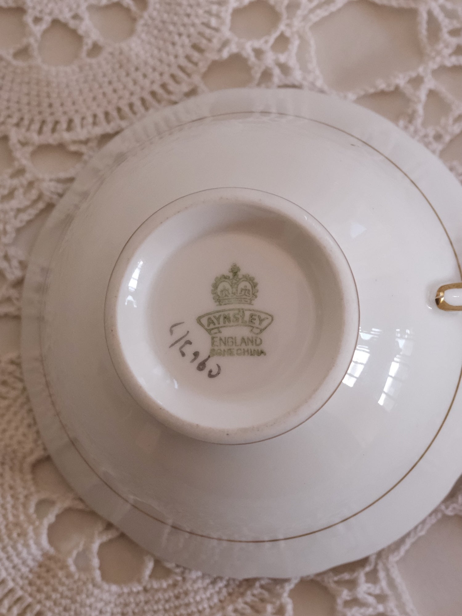 こちらは、エインズレイらしい優雅な表情を見せるカップ&ソーサー “C963”。緑色のバックスタンプや字体、手書きで記されたパターン番号などから、1930年代後半〜1940年代前半の製造と考えられます。