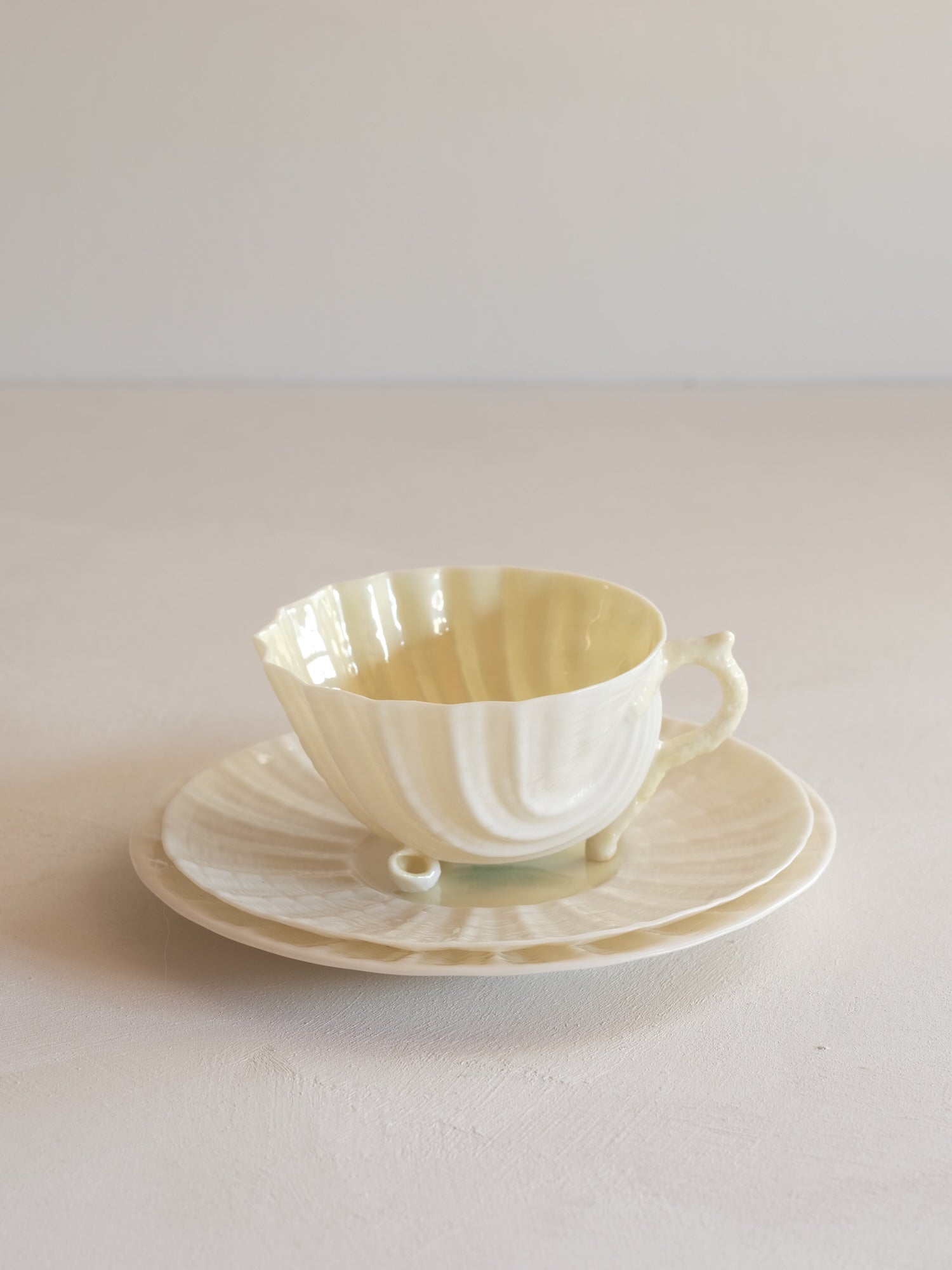 “Neptune” シリーズは、ローマ神話の海神ネプチューンにちなんだデザイン。カップは貝殻をかたどったボディに珊瑚のハンドル、そして小さな巻貝が脚となる独特の造形。内側には貝殻の内面を思わせるパール状の光沢釉が施され、これは釉薬の重なりによって生まれる自然な表情です。ソーサーには波紋と貝殻のレリーフが繊細に刻まれ、どの角度から見ても Belleek の職人仕事ならではの温かみが感じられます。