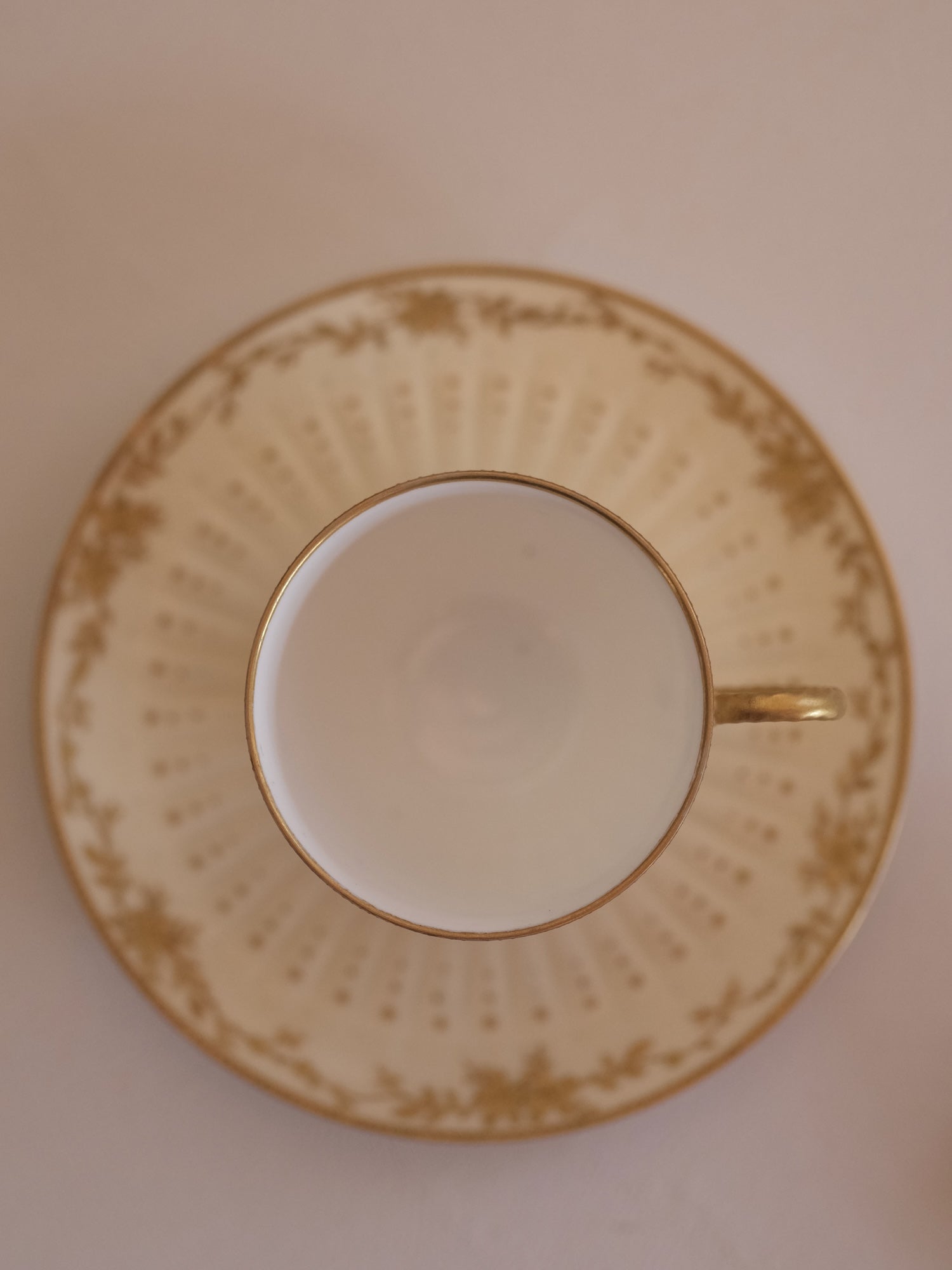 さらに、カップとソーサーには細やかなモールド・レリーフ(エンボス)が施されており、灯りを受けると透かし模様のように浮かび上がる、リモージュ磁器ならではの幻想的な光学効果を生み出します。薄く透光性の高い素地と、計算された立体装飾が重なり合うことで、当時の職人技が息づく独特の表情が楽しめます。