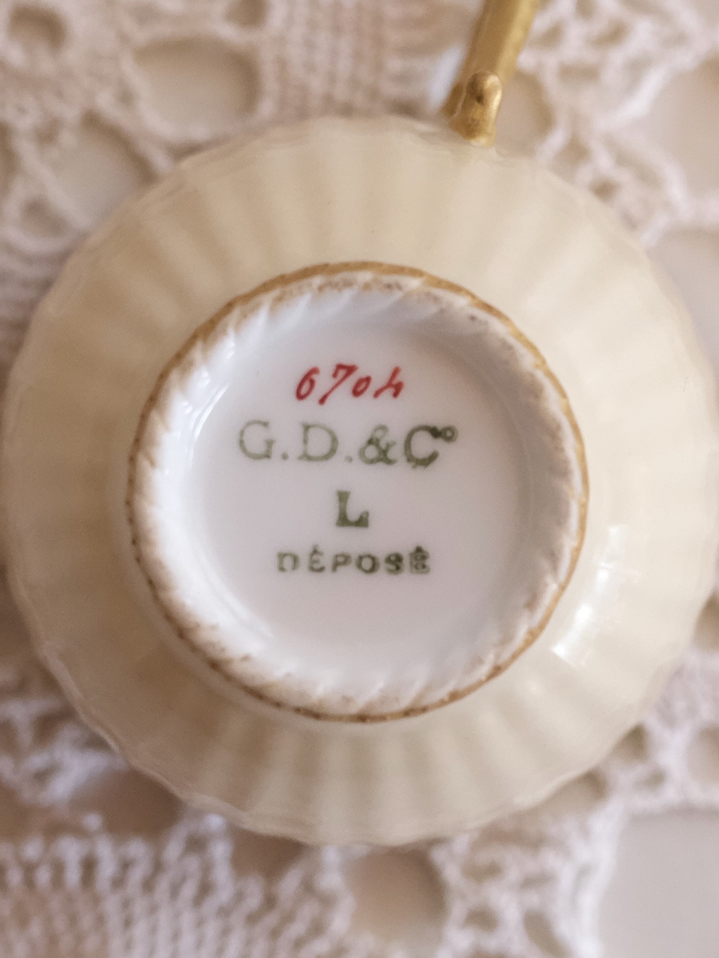 フランス・リモージュの実力派工房 G. Demartine & Cie(G. D. & C°)が手がけたカップ&ソーサーです。裏面には G. D. & C° / L / Déposé の刻印が入り、L は Limoges(リモージュ)で製造されたこと、Déposé は意匠登録済み(デザイン登録) を示しています。