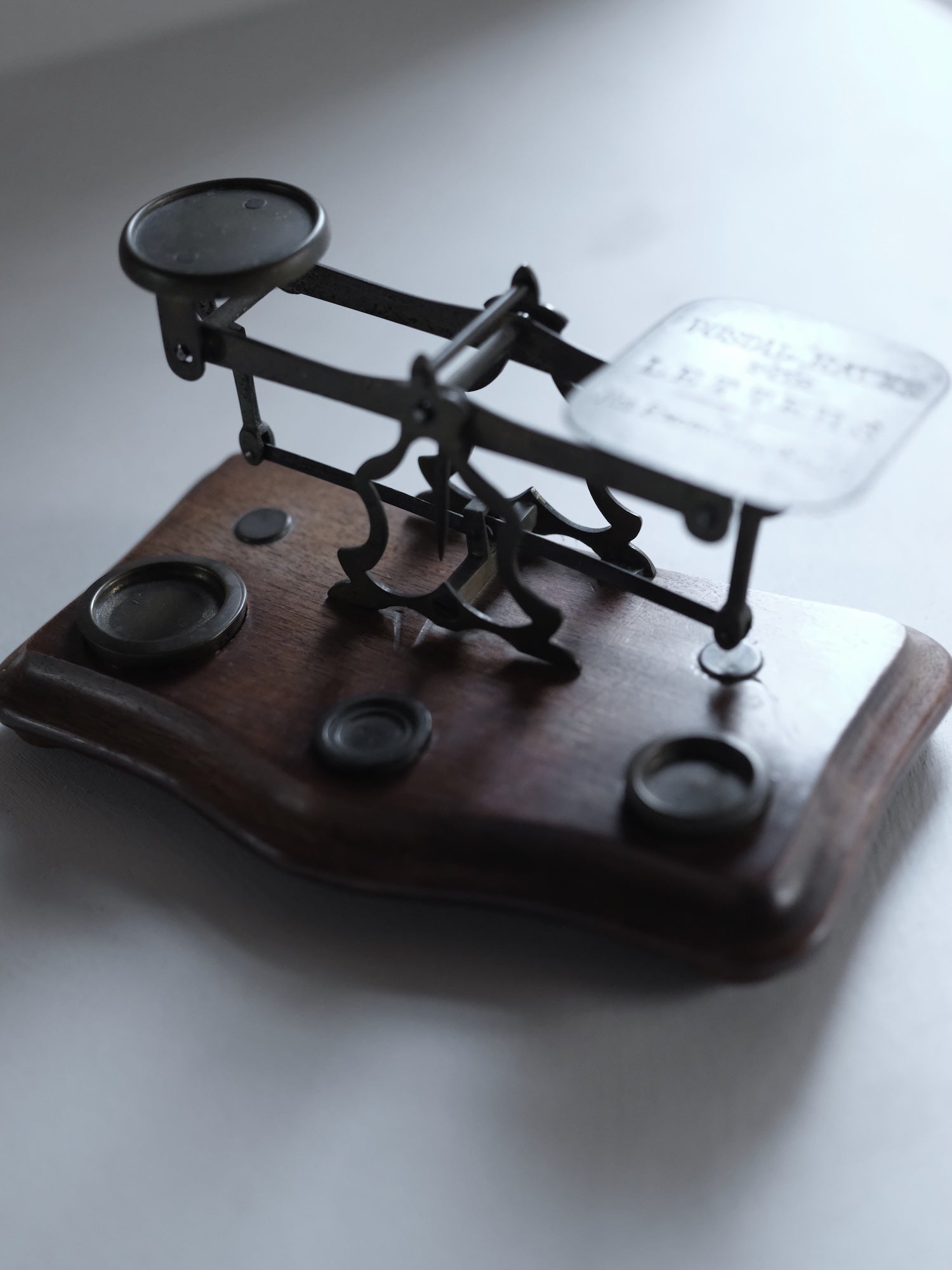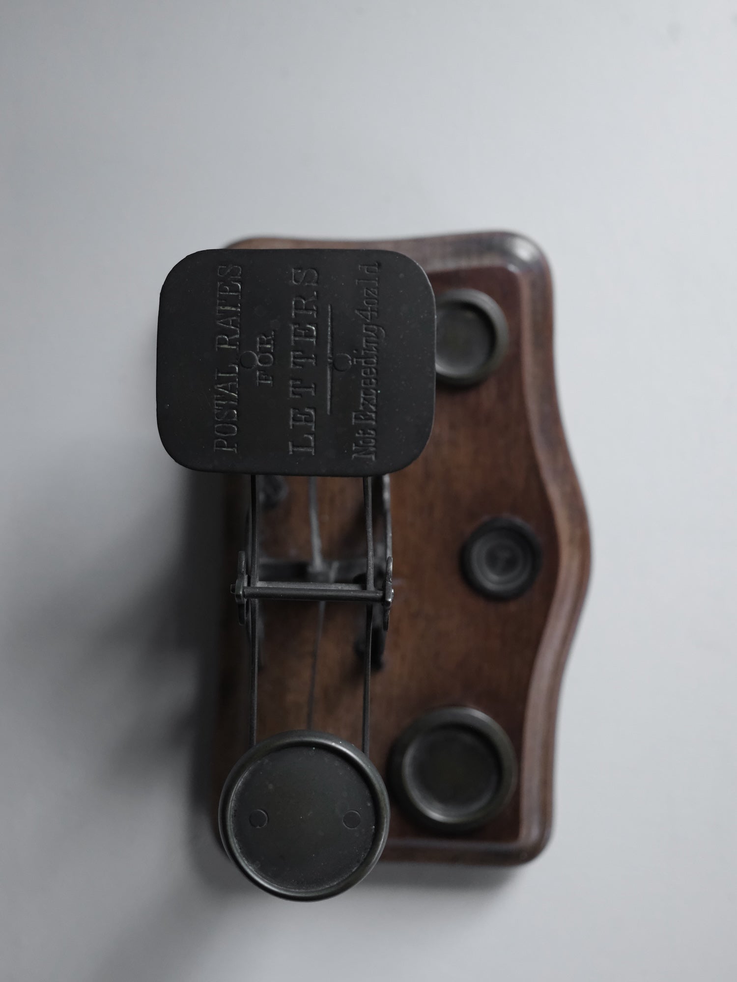 19世紀末〜20世紀初頭のイギリスで実際に使われていた、真鍮と木製の郵便用バランススケール(レタースケール)です。