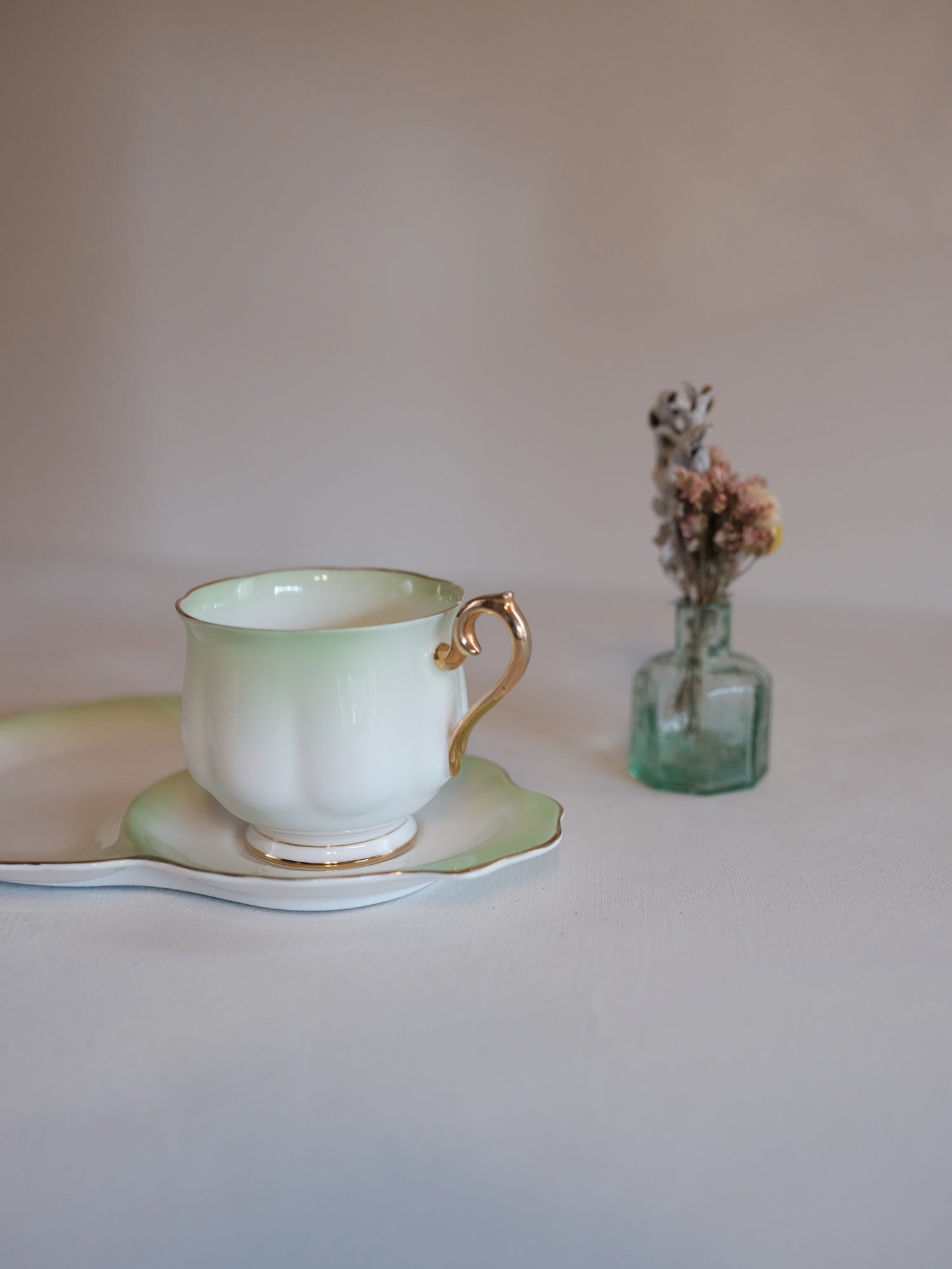 白磁にパステルカラーのグラデーションがかかり、柔らかく移ろう色合位を金彩のリムが優しく縁取ります。経年により金彩にわずかな薄れが見られますが、ヴィンテージ特有の味わいです。過度な摩耗ではなく、年代を重ねた英国窯の表情としてお楽しみください
