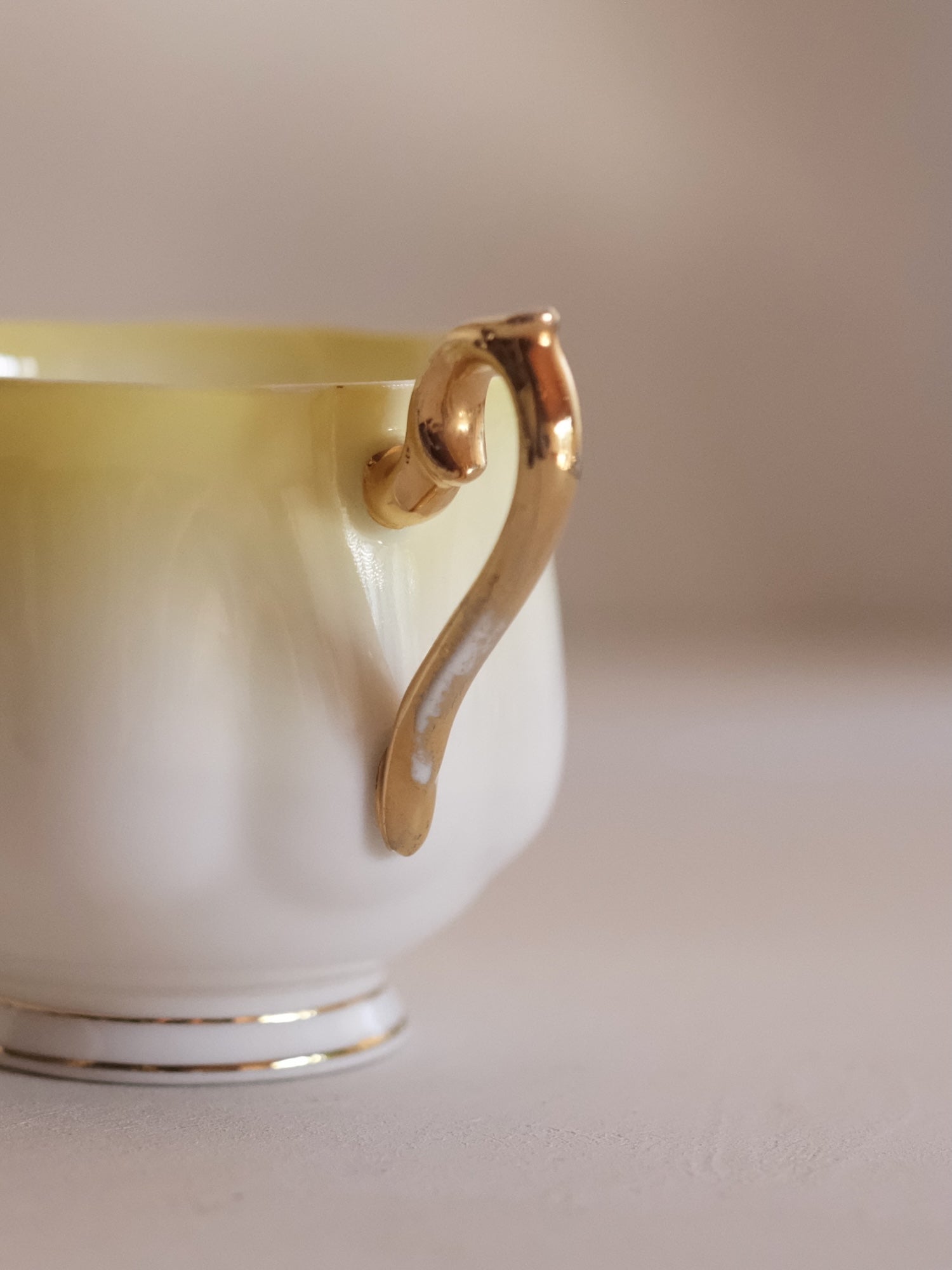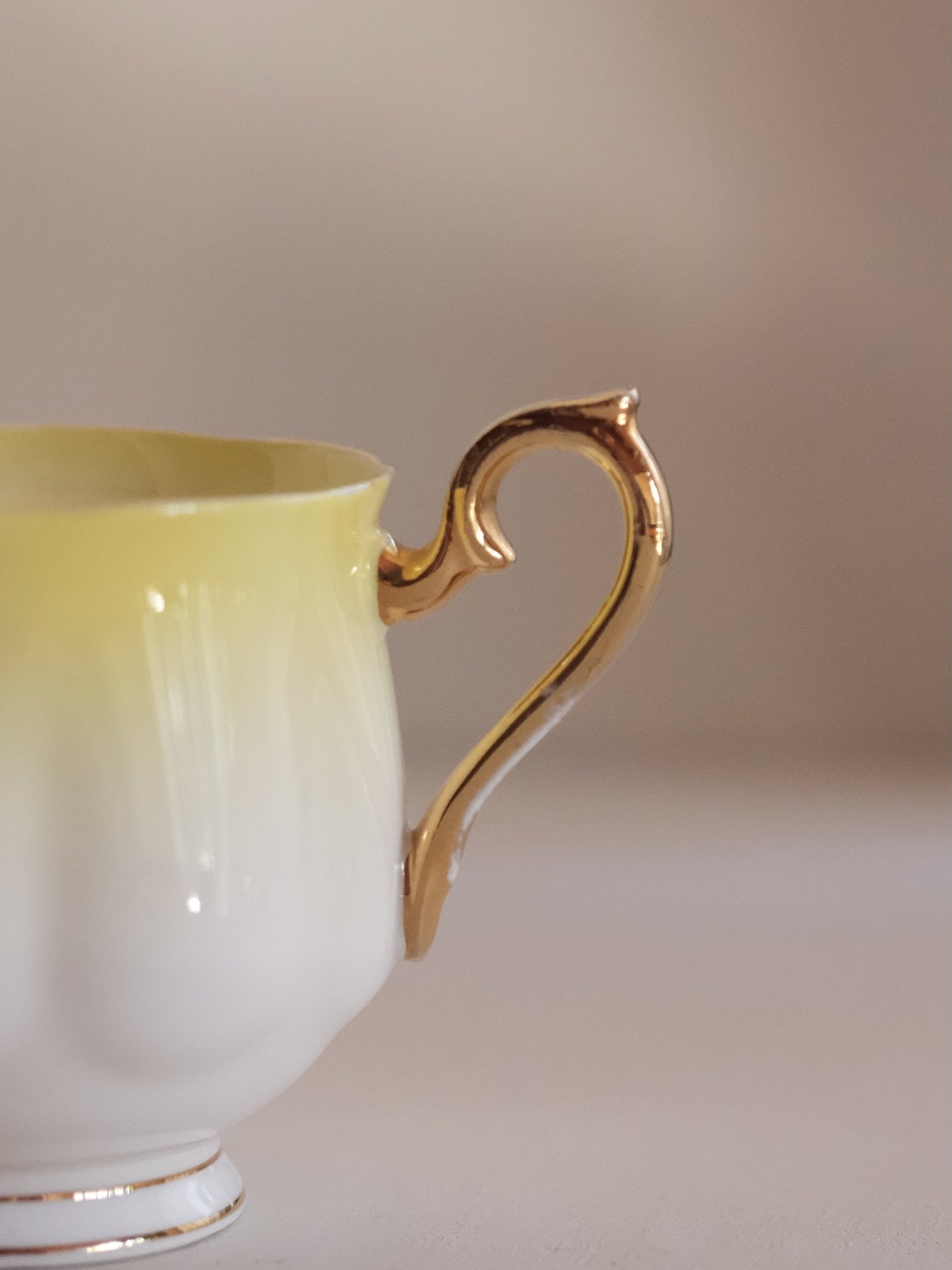 白磁にパステルカラーのグラデーションがかかり、柔らかく移ろう色合位を金彩のリムが優しく縁取ります。経年により金彩にわずかな薄れが見られますが、ヴィンテージ特有の味わいです。過度な摩耗ではなく、年代を重ねた英国窯の表情としてお楽しみください